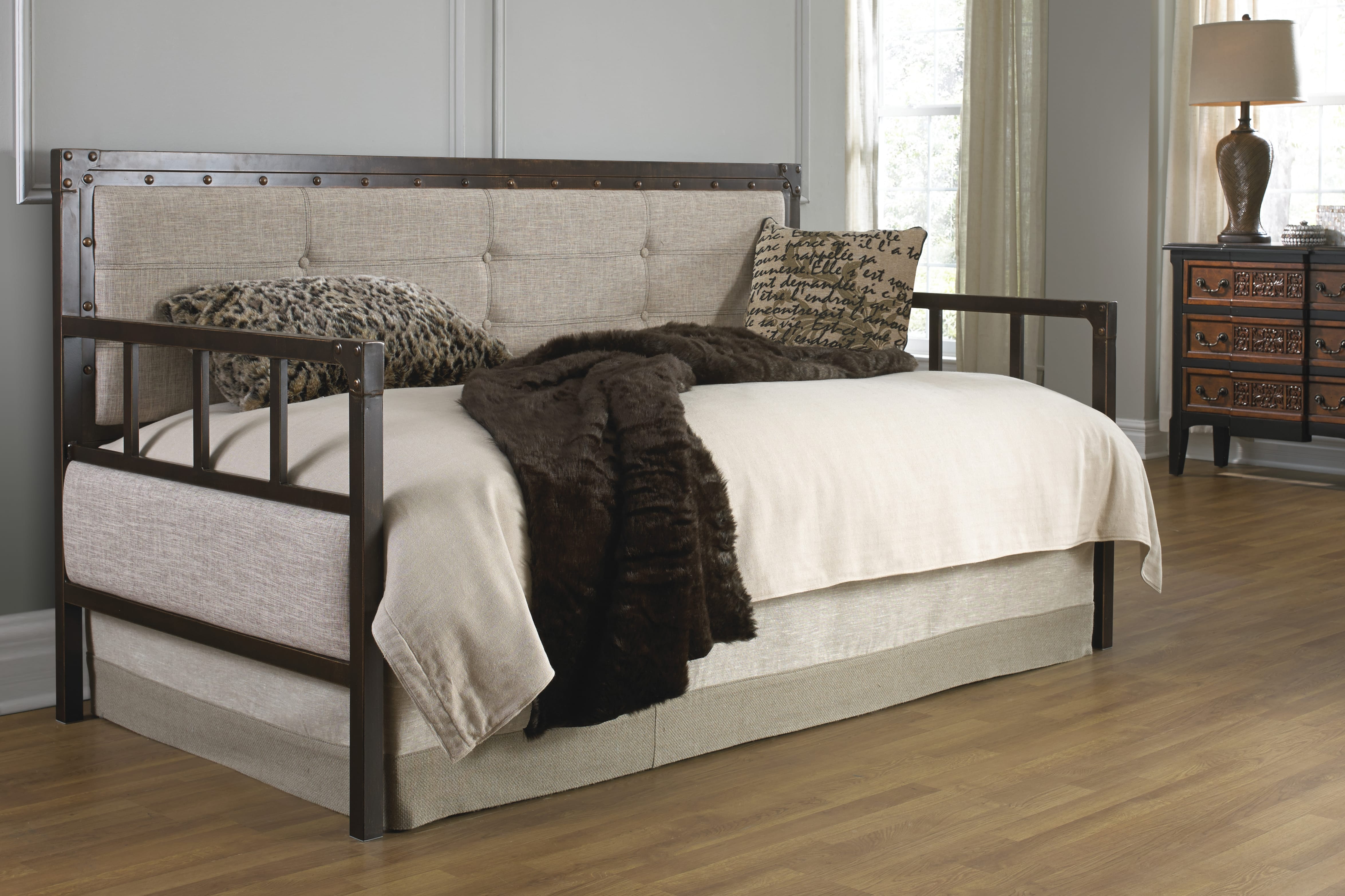 The Gotham daybed employs contrasting materials and rich neutral colors to create the perfect piece for any guest room, office, or den. The metal frame features a rustic Brushed Copper finish and the back panel is lined in antique-looking studs to add an extra layer of appeal. The panels are upholstered in a soft Latte upholstery with button-tufting throughout the back.