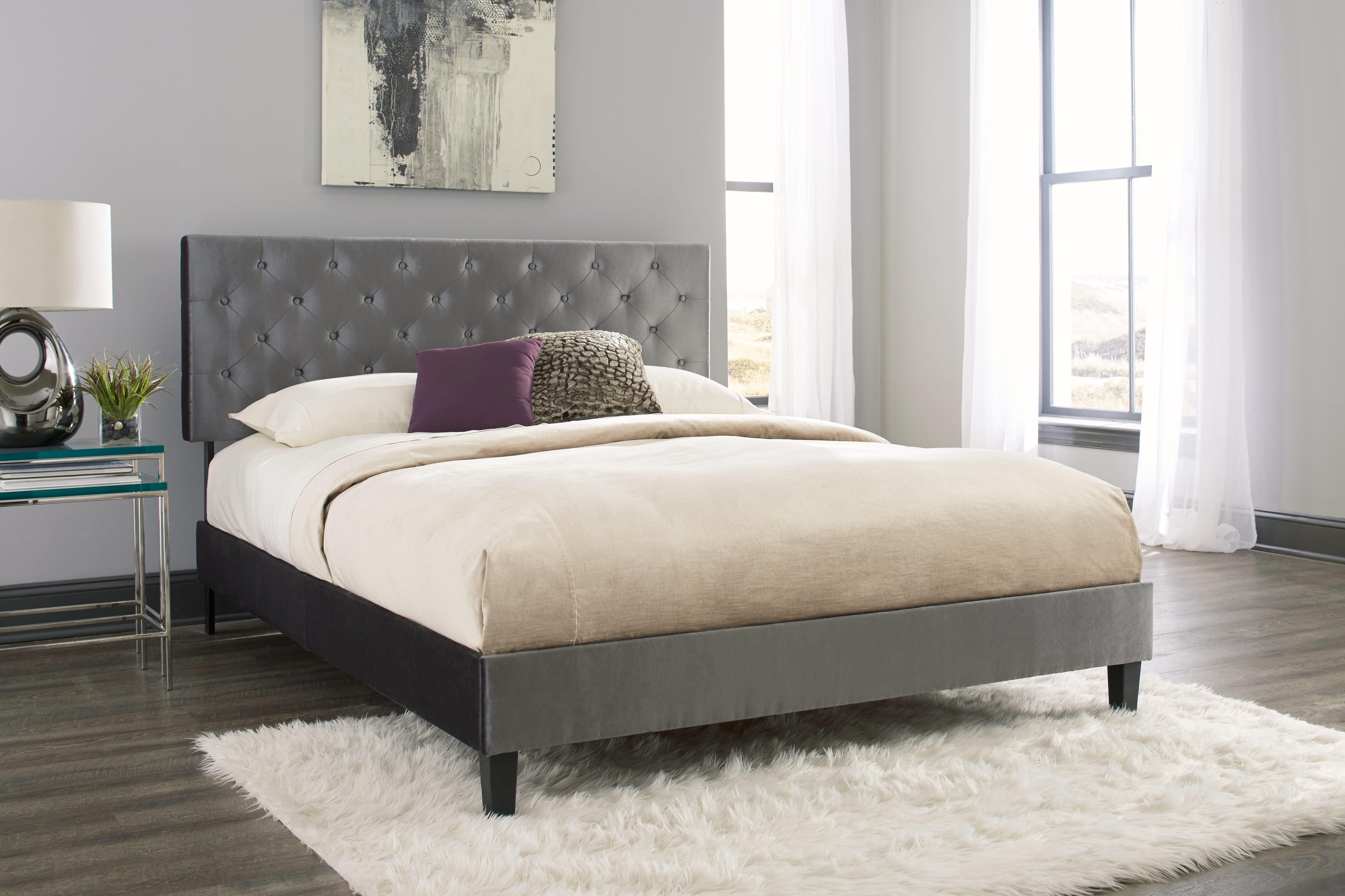Provide your bedroom with top-notch beauty and functionality with the Hayworth Bed. This upholstered bed is available in Velvet Gray fabric. Experience convenience and splendor like never before when you add the Hayworth to your home.