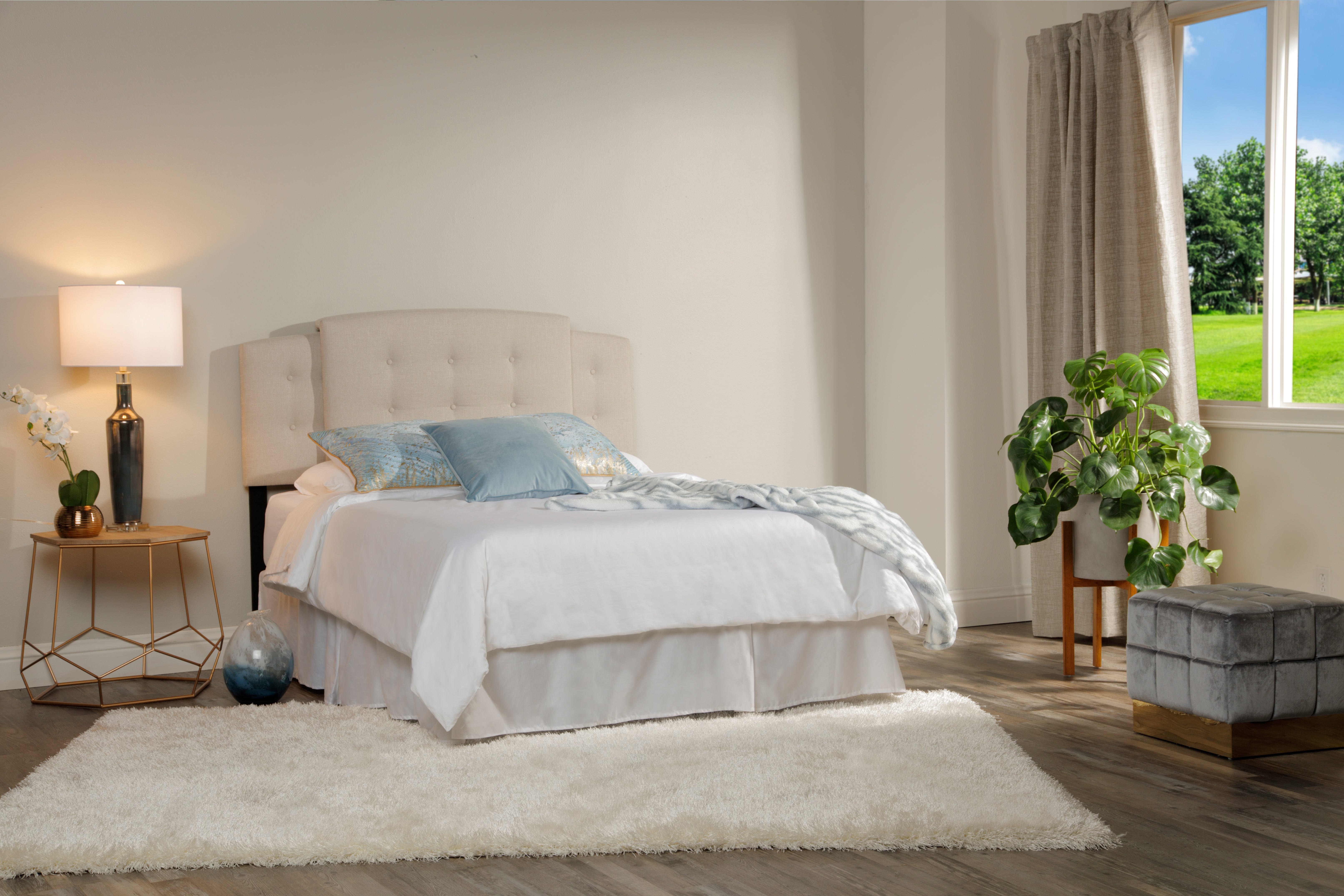 Upholstered in a 100% polyester, Ivory or Putty fabric, the Martinique headboard combines soft, sweeping curves with straight lines to create an enduring transitional style. The button-tufted tailoring, so common to French décor, and the simple, sophisticated fabric work together to marry traditional and contemporary designs. This elegant look is partnered with soft foam padding covering the sturdy, solid wood frame.