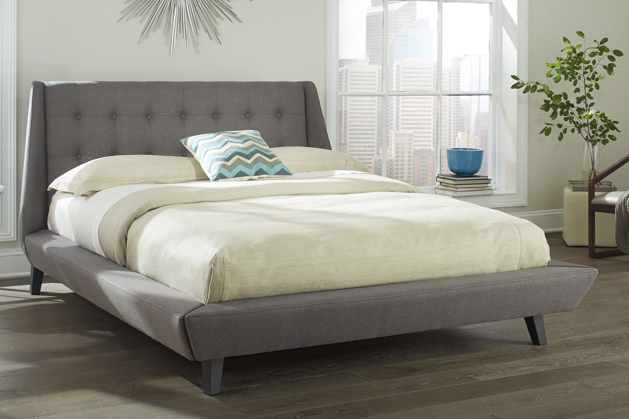 The Prelude bed is styled after the wildly popular mid-century modern look. This stunning platform bed is upholstered in an eye-catching Ash fabric. The headboard features button-tufting to enhance the piece’s visual appeal and is accented by the low side rails and foot in the same upholstery color. The unique color and design of the Prelude bed will serve to add intrigue to any room.